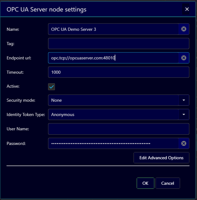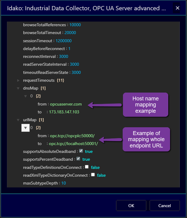 Also, if the server returns endpoint URL with different port number than actual port number the server is listening on, such as in case of port number mapping in Docker containers, it becomes more complicated. To resolve such cases, Edit Advanced Options dialog window has the urlMap field. Here you can enter arrays of pairs which are used to map endpoint URL returned by the server to desired substitute. For example, to connect to the demo OPC PLC server running in Docker container with service name (as well host name) opcplc, with endpoint URL opc.tcp://opcplc:50000/ (note the trailing backslash - it is required too), which is mapped to the Docker host’s port 50001, you can map it to opc.tcp://localhost:50001/.