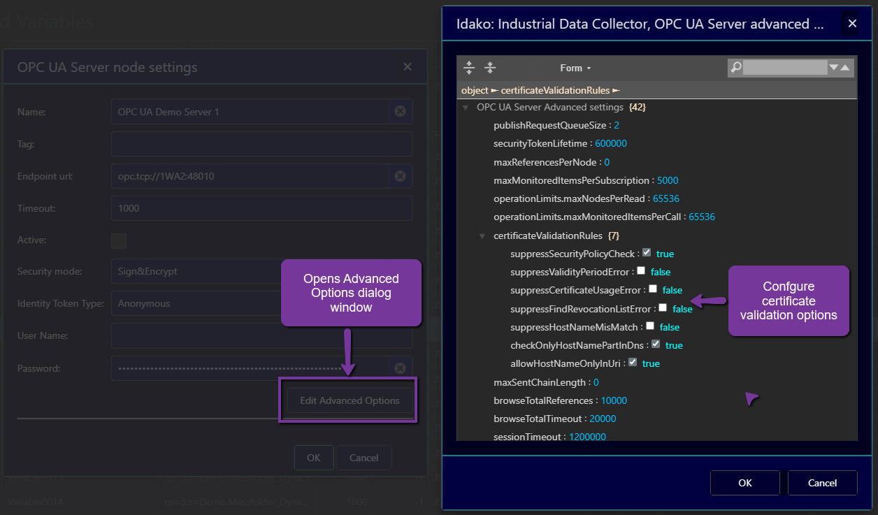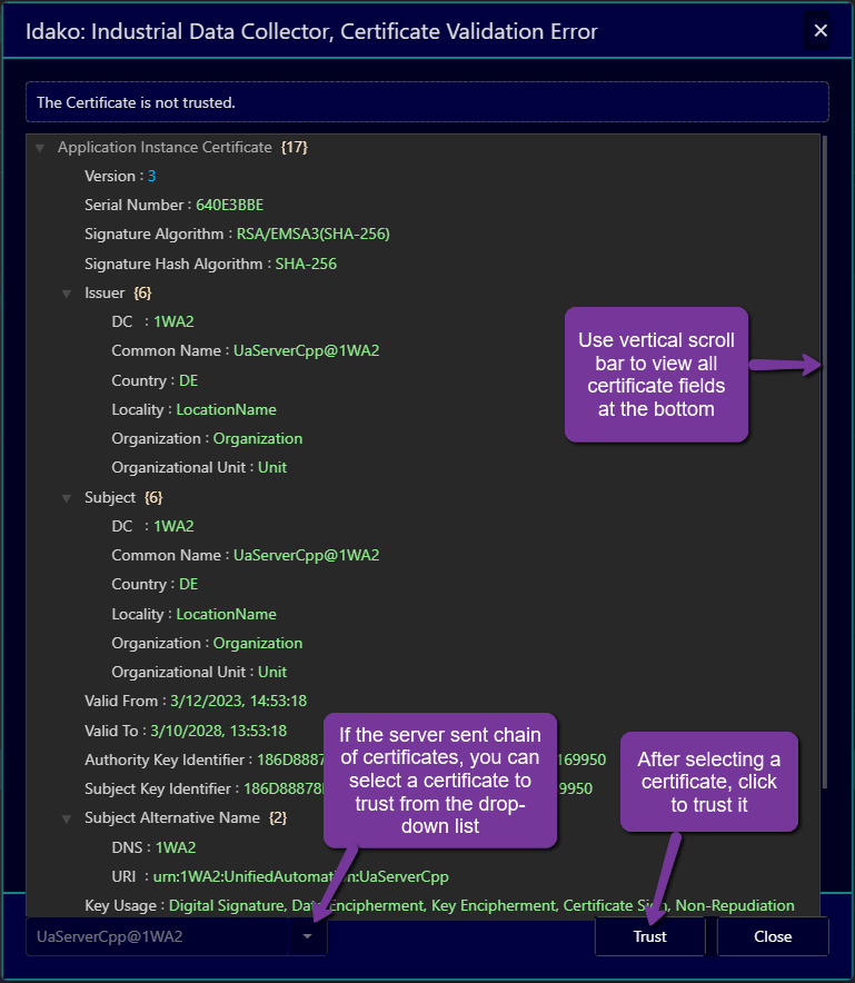 Configuring Idako: Industrial Data Collector to trust to server instance certificates.