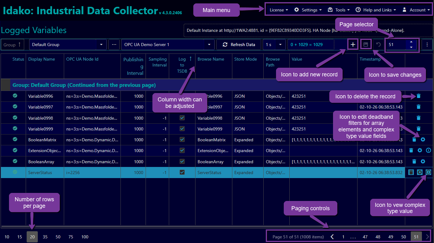 Logged Variables table defines list of OPC UA Variables for which values are collected and logged into time-series database. Some features of the table are highlighted below.