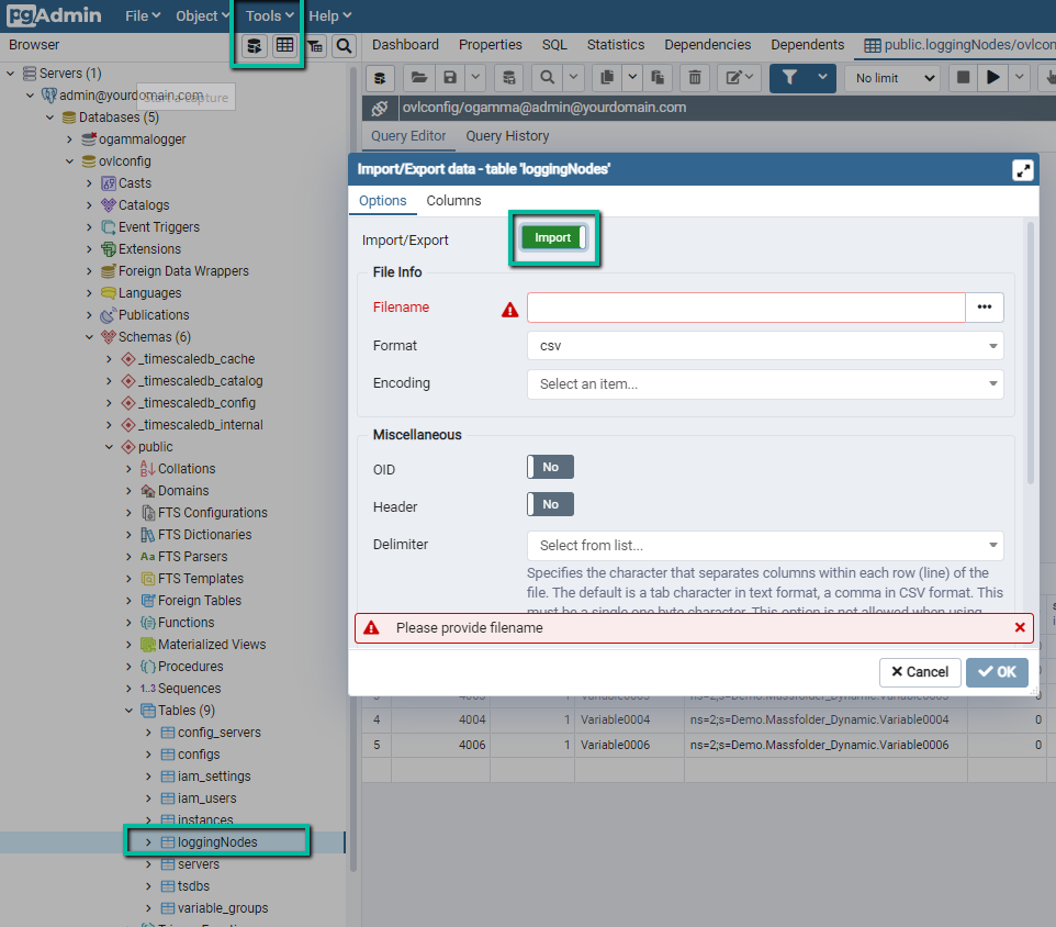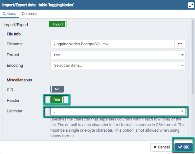 OKto import records.Notification should appear in the PgAdmin GUI, reporting import result. If there were errors, click on the