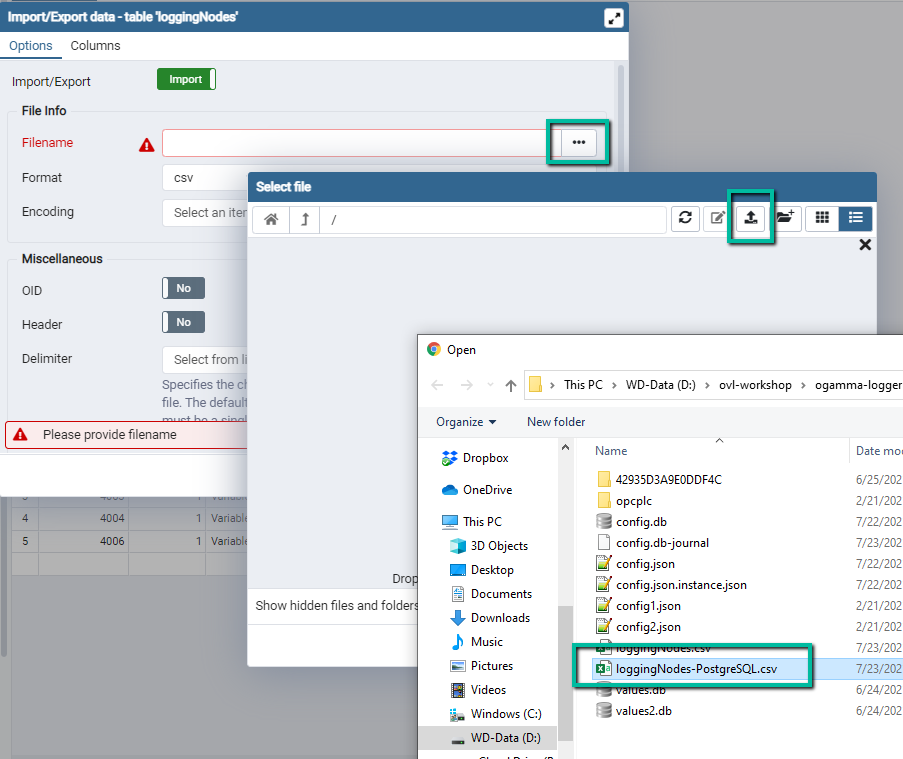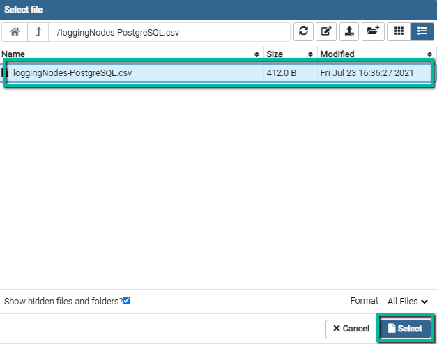 Select Filedialog window. On its toolbar, click on theUpload Fileicon. Double click on the central panel to open file selector and select CSV file, or drug and drop file from the file explorer windows into it.![]()