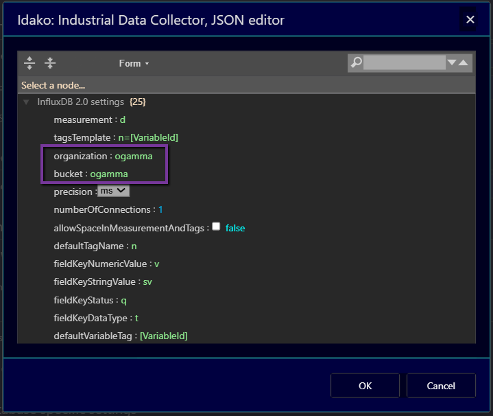 Here you can see that some placeholders are used, which will be substitued at runtime by their actual values: ClienIdBase (base part of the clientId field), [ServerTag] (value of the field Tag in the OPC UA Server settings), [VariableDisplayName] (value of the Display Name column in the Logged Variables table), [InstanceId] (identifier of the Industrial Data Collector application instance).