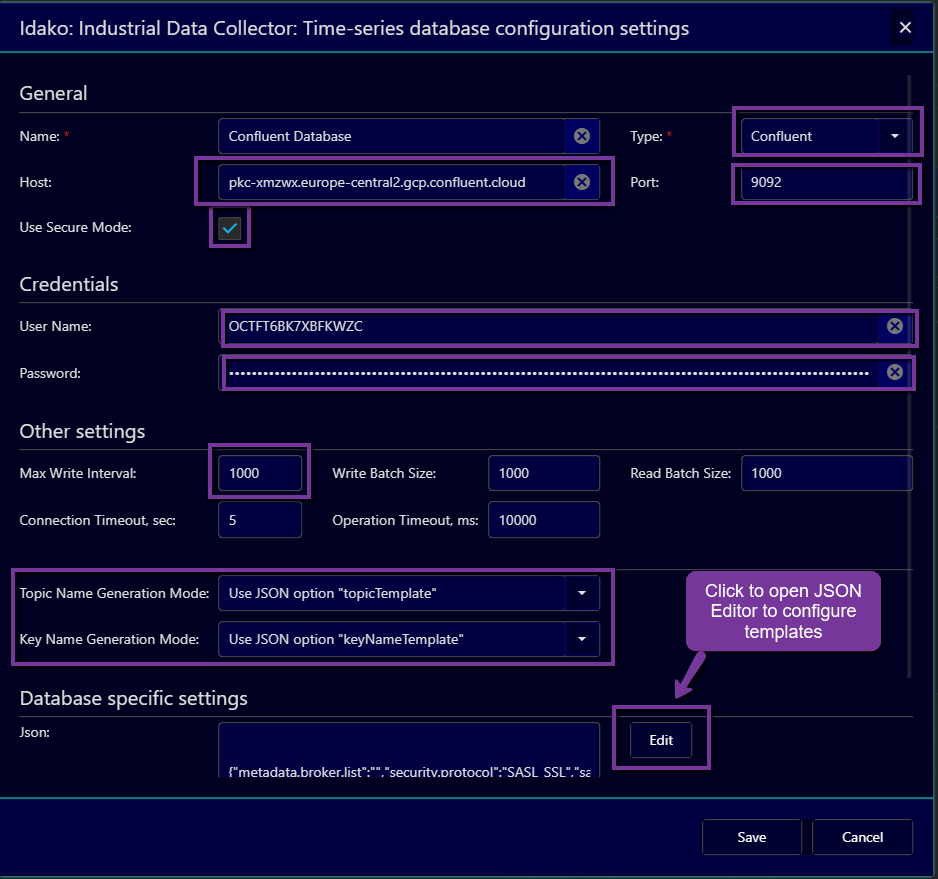 This section describes settings in the Time-Series database connection settings dialog window (opened via menu Settings / Time-Series Databases, by selecting of a row and clicking on the Edit icon).