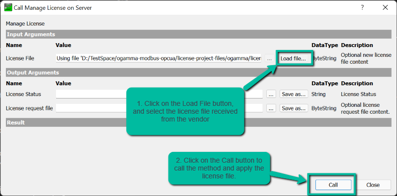 call methoddialog window, and set value of the first argumentLicense Fileby loading it using the buttonLoad Filelocated to the right from it. And then click on theCallbutton to call the method and apply the license file. It shoudl returnOkas value of the first argument in case of success.