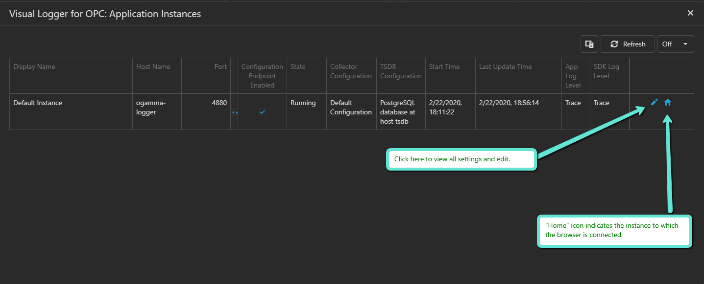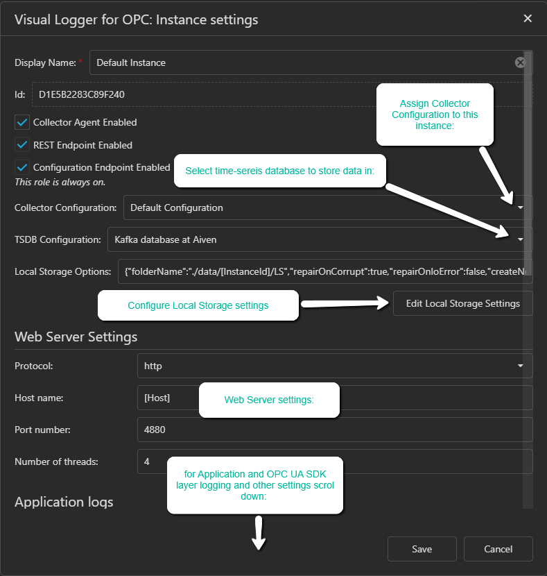 Configuration of the first instance (connections to OPC UA Servers and selection of variables to log, and settings to connect to the TSDB) can be done as for the regular instance.