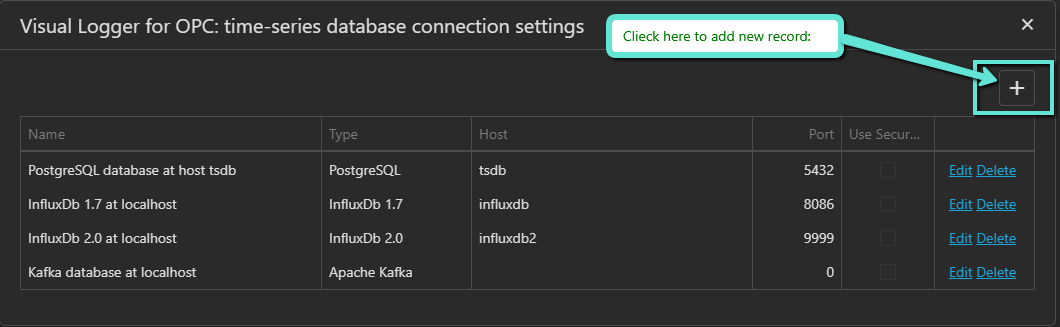 Storetime-series data, i.e. value/quality/timestamps for OPC UA variables. Multiple time-series database connection settings can be configured.Assign specific combination of settings for