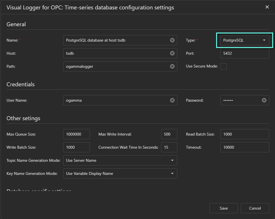 Time-series database is where data values received from OPC UA Servers are stored. It can be either PostgreSQL/TimescaleDB, or InfluxDB, or Apache Kafka, or MS SQL Server, or MySQL, or SQLite.